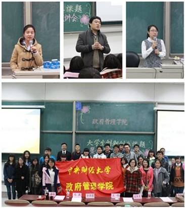2015年3月17日,开云官网在沙河校区主教学楼举行大学生创新创业训练及挑战杯大赛宣讲会。出席本次活动的有城市管理系系副主任王伟副教授,城市管理系那子晔老师,团总支书记李莎莉老师,院教务干事宋红美老师,2013级辅导员孙帮谦老师,以及2014年大学生创新创业课题申报获批的公共管理2012级谭翠萍同学,保险精算13级冯燕同学,国际政治13级林诗雨同学。