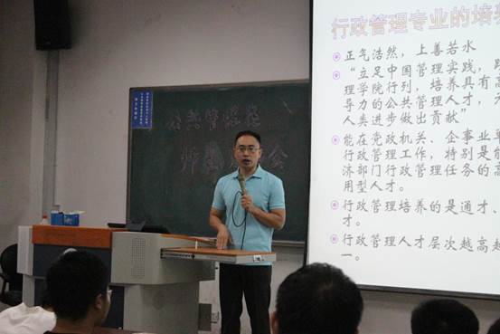 随后,曹堂哲老师介绍了行政管理专业在大学学科体系中的位置、专业培养方案、未来发展方向、大学学习与专业学习的关系。曹老师首先阐述了“行政关系”是公共管理各个学科关注的共同点,而“行政关系”的研究是行政管理专业的基础,行政管理专业在公共管理学科中具有基础性地位。随后曹老师指出行政管理专业培养的是通才、统御之才和领导之才,培养的学生能在党政机关、企事业单位、社会团体从事行政管理工作,特别是能够承担政府综合部门行政管理任务的高素质、复合型和应用型人才。曹老师还介绍了开云官网公共管理专业“1+3”人才培养模式和行政管理专业的知识结构,详细介绍了行政管理专业的知识模块。曹老师着重分析了我校行政管理专业的特色和优势,逻辑严谨,富有哲理,引起了同学们的强烈共鸣。