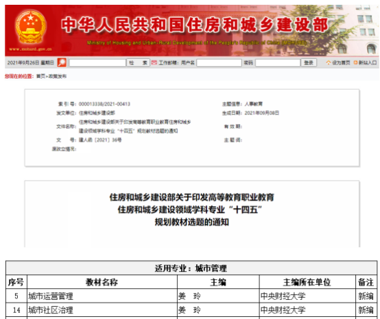 姜玲院长主编的两部教材入选住房和城乡建设领域学科城市管理专业“十四五”规划教材选题