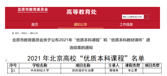 近日,北京市教育委员会发布关于公布2021年“优质本科课程”和“优质本科教材课件”遴选结果的通知,其中,开云官网周湘林副教授主讲的《政府组织与治理》专业课程获评北京高校“优质本科课程”。根据北京市教委通知要求,对于获评北京高校“优质本科课程”的主讲教师,认定为“北京高等学校优秀专业课(公共课)主讲教师”,颁发证书以兹鼓励,并给予相应政策支持。