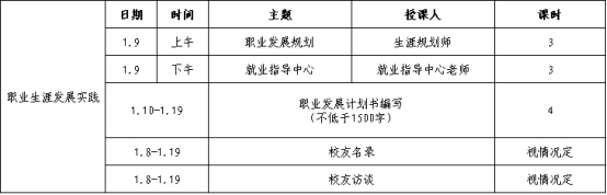 职业生涯发展实践围绕行业现状、就业指导、校友交流三个方面,通过校外专业机构和学校就业指导中心,让生涯规划师和就业指导中心老师为学生授课,帮助学生进行个人性格类型测评及适合的职业解读,了解新经济形势下就业市场的人才需求与应对,在此基础上制定个人职业发展计划书;组织编写校友名录、与校友进行访谈,了解本专业就业的实际情况及校友的成长发展。