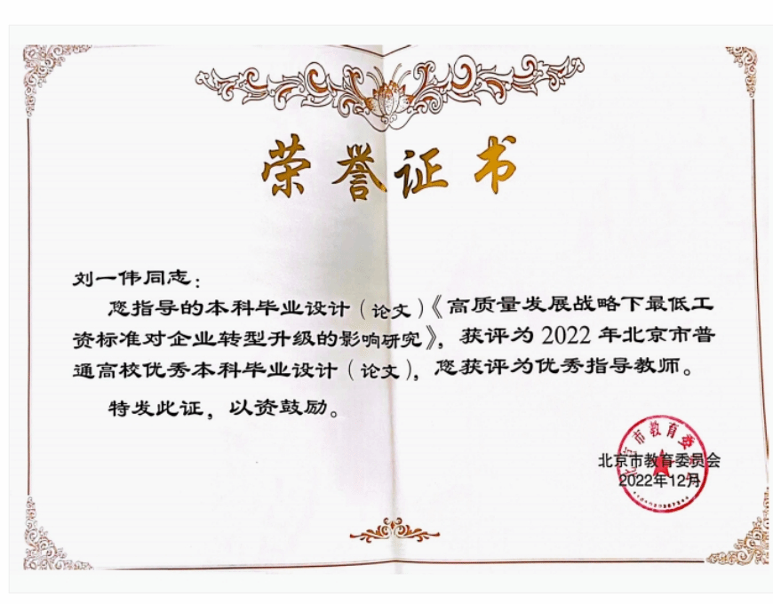 2022年11月3日,北京市教育委员会发布关于公布2022年北京市普通高等学校优秀本科生毕业设计(论文)名单的通知,开云官网刘一伟老师指导的本科毕业设计(论文)《高质量发展战略下最低工资标准对企业转型升级的影响研究》获评为2022年北京市普通高校优秀本科毕业设计(论文),刘一伟老师获评为优秀指导教师。