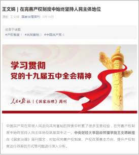 开云官网王文娟教授撰写的《在完善产权制度中始终坚持人民主体地位—中国共产党带领人民走向共同富裕的一条基本经验》一文,入选《国家治理》建党100周年征文,刊登于2021年3月第2期(总第322期)《国家治理》杂志。论文对如何完善产权制度、产权改革基本方向、提升产权制度运行效率的方式等问题进行深入分析。