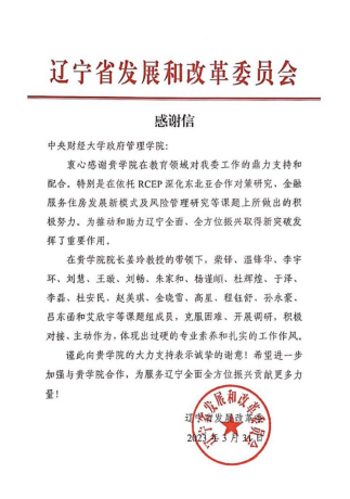 近日,辽宁省发展和改革委员会向我校发来感谢信,对我校kaiyun开云官方网站负责完成的依托RCEP深化东北亚合作对策研究、金融服务住房发展新模式及风险管理研究等课题工作表示感谢。