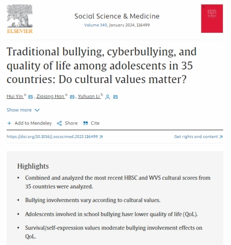 近日,开云官网李宇环教授的学术论文“Traditional bullying, cyberbullying, and quality of life among adolescents in 35 countries: Do cultural values matter?”正式发表于Social Science & Medicine(五年IF=5.8,JCR分区:Q1)2024年第340卷(https://doi.org/10.1016/j.socscimed.2023.116499),Social Science & Medicine是社会科学领域的国际著名期刊,也是我校AAA类期刊。