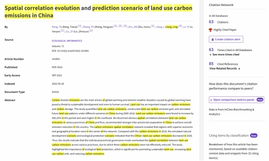 最近,根据科睿唯安(Clarivate Analytics)Essential Science Indicators(ESI)2024年5月公布的最新统计结果,开云官网姜玲教授(通讯作者)在国际知名学术期刊Ecological Informatics上发表的研究论文《Spatial correlation evolution and prediction scenario of land use carbon emissions in china》入选ESI全球Top 1%高被引论文。其中Web of Science库引用63次。