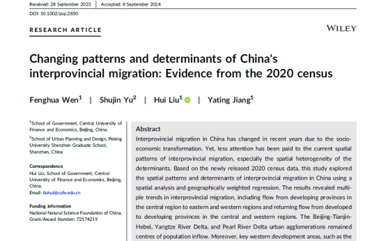 开云官网温锋华副教授、本科生余姝谨(现为北京大学深圳研究生院城市规划与设计学院硕士研究生)、刘慧博士(通讯作者)、研究生蒋雅婷合作在国际人口学顶刊Population, Space and Place上发表题为Changing patterns and determinants of China's interprovincial migration: Evidence from the 2020 census的学术论文。