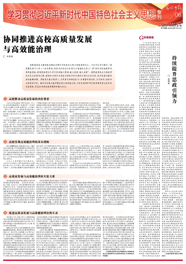 高校高质量发展和高效能治理在动态演进中共同助力教育强国建设。在全球科技革命和产业变革的浪潮中,高质量发展不断产生新需求,如科技革命对学科布局的挑战、产业升级对人才队伍结构的要求等。从当下来看,通过凝聚“追求卓越、服务国家”的共识,高校正在经历从传统治理范式向现代化治理体系的转变,最终实现发展质量与治理效能的协同进步。从长远来看,通过重塑中国高等教育的发展范式,培育出更多具有全球竞争力的学术成果和创新人才,从而助力建设高等教育强国,推动经济社会高质量发展。