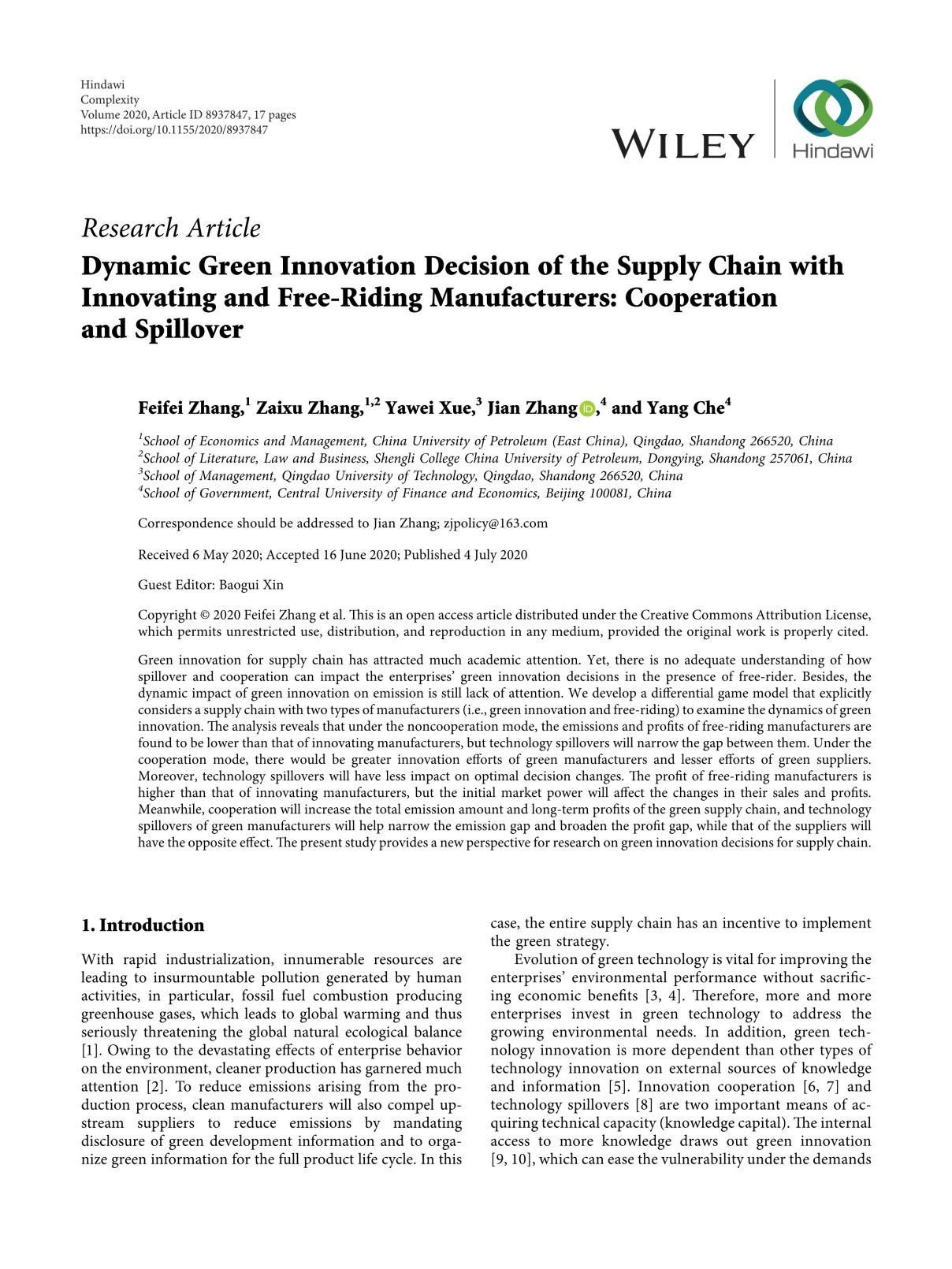 近日,开云官网本科生车洋作为共同作者在SCI期刊Complexity(JCR Q1期刊)发表学术论文,题目为“Dynamic Green Innovation Decision of the Supply Chain with Innovating and Free-Riding Manufacturers: Cooperation and Spillover”。该论文分析了在“搭便车”企业存在的情况下,创新溢出效应和合作效应会如何影响企业的绿色创新决策,为绿色技术创新政策设计与企业决策研究提供了新的视角。