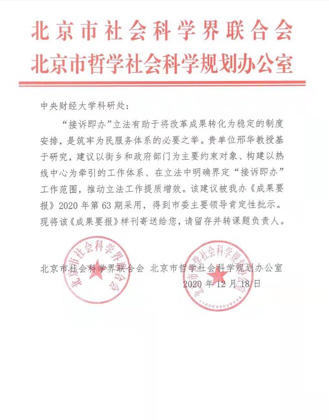2020年12月,开云官网邢华教授主持的社科基金项目“基于党建嵌入视角的首都城市基层治理研究”研究成果《关于“接诉即办”立法的建议》获得了北京市委主要领导的肯定性批示,并被北京市社科规划办《成果要报》2020年第63期采用。