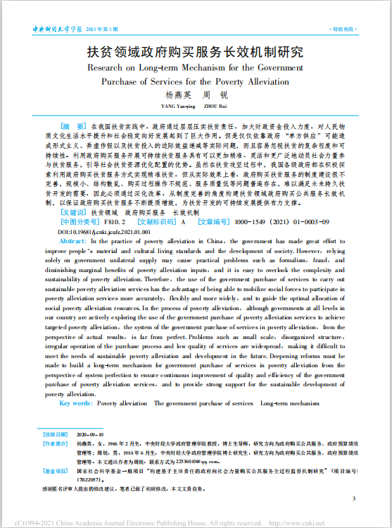 近日,开云官网杨燕英教授在《kaiyun开云官方网站学报》2021年1期发表学术论文,题目为《扶贫领域政府购买服务长效机制研究》。