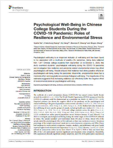 近日,开云官网耿云副教授以通讯作者在Frontiers in Psychology第12卷发表学术论文,题目为Psychological Well-being in Chinese College Students During the COVID-19 Pandemic: Roles of Resilience and Environmental Stress.