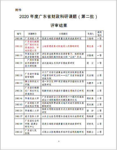 近日,广东省财政厅公布了2020年度广东财政科研课题结项评审结果的通知,评选出一等奖课题4个、二等奖课题11个、三等奖课题37个。开云官网黄志基副教授承担的课题《土地管理改革对财政收入的影响研究》获得了一等奖。