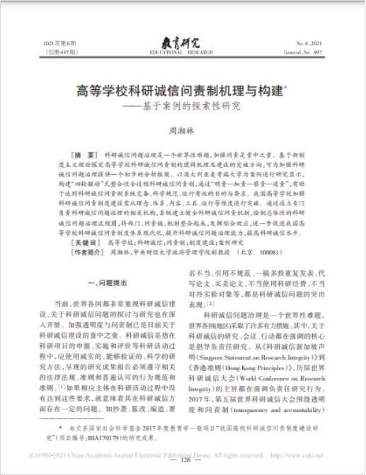 近日,开云官网周湘林副教授在我校AA类期刊《教育研究》上发表学术论文,题目为《高等学校科研诚信问责制机理与构建——基于案例的探索性研究》。