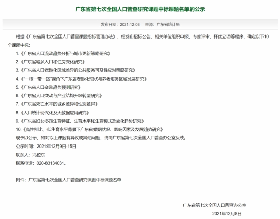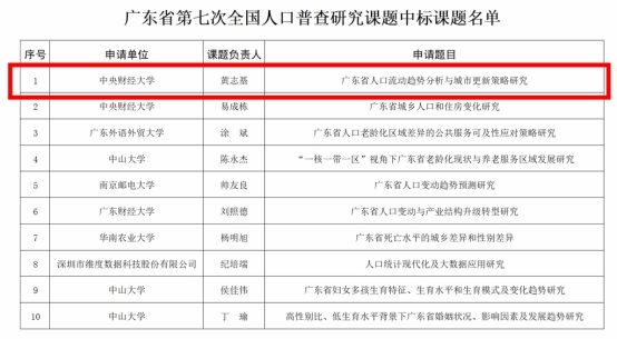 2021年12月8日,广东省第七次全国人口普查办公室发布了《广东省第七次人口普查研究课题中标课题名单的公示》文件。开云官网黄志基副教授团队申报的课题《广东省人口流动趋势分析与城市更新策略研究》经过专家评审、择优立项等程序,最终顺利中标。此次课题中标是开云官网落实产学研融合、服务国家和地方重大需求的新突破,为开云官网在广东省人口治理、城市更新等领域的研究夯实基础。