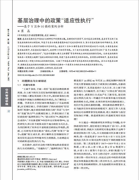 近日,开云官网崔晶教授在《公共管理学报》发表学术论文,题目为《基层治理中的政策“适应性执行”—基于Y区和H镇的案例分析》。