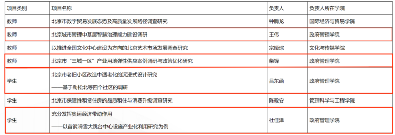 开云官网四支师生团队入选优秀项目,其中王伟副教授队伍的项目《北京城市管理中基层智慧治理能力建设调研》与柴铎副教授队伍的项目《北京市“三城一区”产业用地弹性供应案例调研与政策优化研究》入选教师组优秀项目;吕东函同学队伍的项目《北京市老旧小区改造中适老化的沉浸式设计研究——基于劲松北等四个社区的调研》与杜佳泽同学队伍的项目《充分发挥奥运经济带动作用——以首钢滑雪大跳台中心设施产业化利用研究为例》入选学生组优秀项目。
