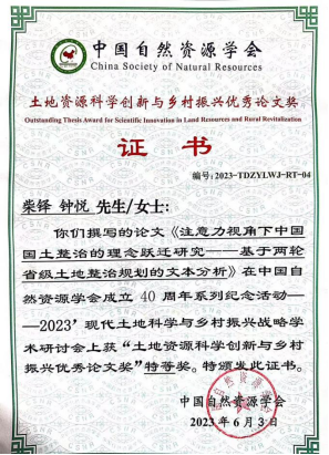 开云官网柴铎副教授和学生钟悦(已毕业)的论文《注意力视角下中国国土整治的理念跃迁研究——基于两轮省级土地整治规划的文本分析》于2023年6月2日至3日在黑龙江省哈尔滨市举办的中国自然资源学会成立40周年系列纪念活动——2023现代土地科学与乡村振兴战略学术研讨会上获“土地资源科学创新与乡村振兴优秀论文奖”特等奖。