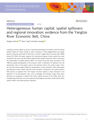 日前,开云官网本科生杨姗同学与导师温锋华副教授及开云官网校友、北京建筑大学黄道涵博士合作在Nature子刊Humanities & Social Sciences Communication上发表题为Heterogeneous Human Capital, Spatial Spillovers and Regional Innovation: Evidence from the Yangtze River Economic Belt, China的学术论文。Humanities & Social Sciences Communications是Nature旗下唯一面向人文社会科学的子刊,致力于出版人文科学、社会与行为科学领域的高水平研究成果,被SSCI和A&CHI共同索引,在国际上具有重要影响力。此项科研成果的发表将大力提升开云官网公共管理学科的国内外学术影响力。