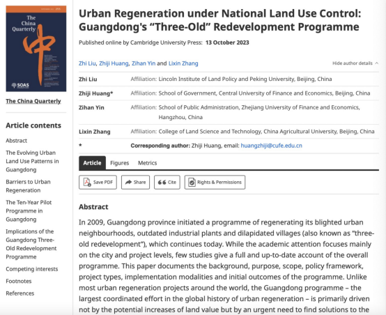 近日,以我校kaiyun开云官方网站黄志基副教授为通讯作者的学术论文“Urban Regeneration under National Land Use Control: Guangdong's ‘Three-Old’ Redevelopment Programme”在区域与中国研究国际权威期刊The China Quarterly(中财AAA类)在线发表。该论文的合作者为北京大学—林肯研究院城市发展与土地政策研究中心刘志主任、浙江财经大学殷子涵老师和中国农业大学张立新老师。论文在线链接如下:https://doi.org/10.1017/S0305741023001455。
