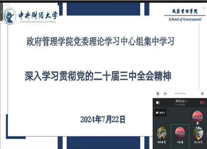 于鹏指出,对于高校二级学院而言,要把学习好贯彻好全会精神作为当前和今后一个时期的重大政治任务。一是要充分认识党的二十届三中全会的重大意义,坚定全面深化改革的历史自信,切实把思想和行动统一到党中央决策部署上来。二是要精心组织学院各党支部、党员干部和师生学习党的二十届三中全会精神,迅速兴起学习宣传贯彻全会精神的热潮。组织好全会精神的宣讲培训,将全会精神全面融入教育教学和人才培养过程之中,科学合理安排秋季学期“开学第一课”内容,确保全会精神有机融入公共管理学科课程思政体系建设之中。三是要结合公共管理学科特色做好研究阐释工作,立足教育科技人才体制机制一体改革不断推进教育强国建设的大背景,围绕全会提出的国家治理体系与治理能力现代化、新质生产力、财税体制改革、新型举国体制、全过程人民民主、城乡融合发展、民生保障制度体系、生态文明体制改革、国家安全体系和能力现代化等关键议题开展重点研究。