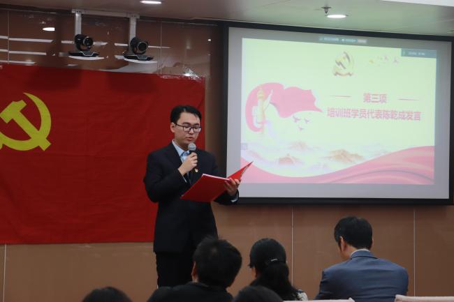 公共事业管理22班陈乾成作为培训班学员代表发言,他对党组织的培养表示感谢,并代表全体学员承诺,珍惜机遇,认真学习出实效,学有所思,深入学习促提升,知行合一,学以致用利长远,争取早日由预备党员转为正式党员。他号召学员们要积极发扬中财人“财经报国”的光荣传统,以实际行动参与到推进中国式现代化的伟大征程中,践行“请党放心,强国有我”的青春誓言,为强国建设、民族复兴伟业贡献青春力量。