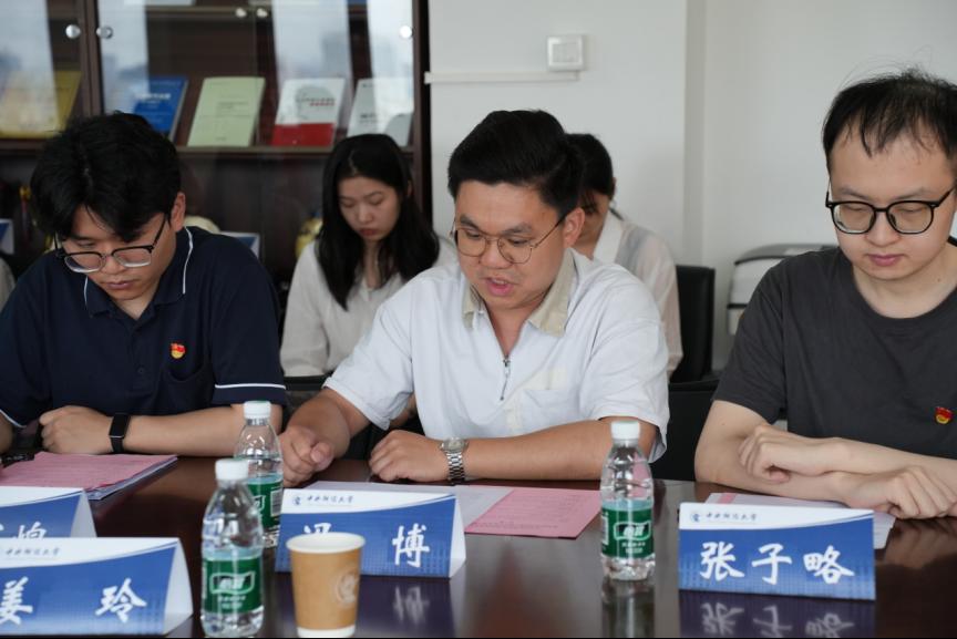 接着,支部党员冯博作为即将奔赴基层工作的毕业生代表,围绕如何在公职岗位上深入贯彻落实中央八项规定精神进行了交流分享。他从完整、准确理解中央八项规定精神出发,强调在政策执行中必须力戒“一刀切”等形式主义问题。他表示,未来将坚持深入基层、调查研究、全面了解真实情况,坚决反对形式主义、杜绝官僚主义,严守纪律规矩、保持清正廉洁,用实际行动诠释新时代中财学子的忠诚与担当。