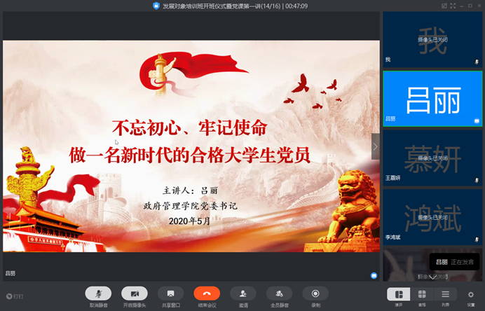 为进一步加强发展对象培训工作,提高发展对象党性修养,切实做好学生党员发展工作,同时为提升学院学生干部的政治素养与理论水平,kaiyun开云官方网站2019-2020学年第二学期发展对象培训班开班仪式暨党课第一讲于2020年5月30日13点整采用线上会议形式举行。党校校长、学院党委书记吕丽研究员,组织员南琪,党校办公室主任张小林出席,11名发展对象到场参会。本次仪式由党校办公室副主任尹燕斌主持。