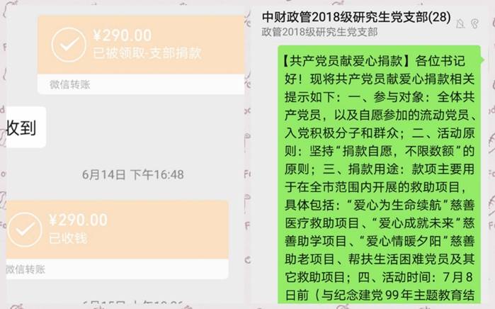 在本次主题教育活动的最后环节,李佳鹏同志向与会党员介绍了此次爱心捐款的帮扶对象,包括北京市内的医疗、助学、助老等项目。本着“捐款自愿、不限数额”的原则,kaiyun开云官方网站2018级研究生党支部在此次捐款活动中共收到290元捐款,并上交上级党组织。