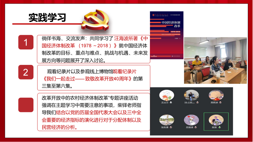 “星星之火,可以燎原”。“燎原”小组成员通过对改革开放四十年经济体制改革的系统学习,认识到中国在四十年间的经济飞跃在人类历史上是绝无仅有的壮举。作为新时代的青年大学生,必须在追随党的领导的同时不断加强自己的科学文化素养、思想道德素养,党性修养,才能真正成为社会主义事业的接班人。作为一名要求进步的大学生,将自己的个人理想与我们伟大中国梦结合起来。以小我之青春,筑中国之辉煌,无愧于时代和人民。