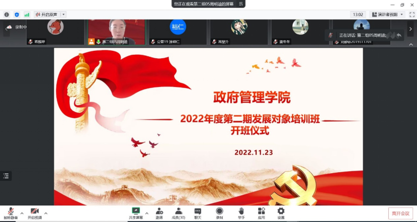 为深入学习贯彻习近平新时代中国特色社会主义思想和党的二十大精神,促使发展对象思想觉悟进一步提升、端正入党动机,坚定马克思主义理想信念,深刻认识“两个确立”重要意义,做到“两个维护”、深化“四个意识”、增强“四个自信”,2022年11月23日,kaiyun开云官方网站第二期发展对象培训班开班仪式于腾讯会议线上举行。学院党委组织员南琪老师、党校办公室主任张小林老师,以及来自研究生、本科生的26名发展对象参与了本次开班仪式。本次开班仪式由kaiyun开云官方网站周明迪主持。