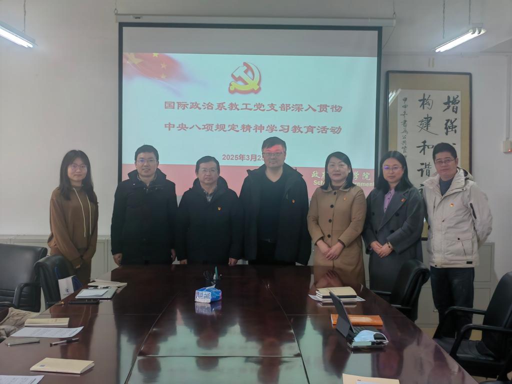 在原原本本认真研读学习的基础之上,结合国际政治系的学科特点以及个人工作学习实际,支部党员畅谈了关于贯彻中央八项规定精神和加强党的作风建设的意义。大家一致表示,要将学习成果转化为推动进一步学习和工作的强大动力。此次学习活动,进一步增强了支部党员对八项规定的理解和认识,也进一步增强了支部的凝聚力和战斗力。
