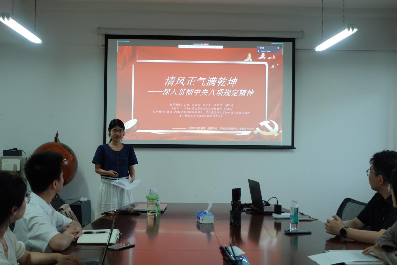 为扎实开展深入贯彻中央八项规定精神学习教育,强化党员理论武装,在学院党委的统筹安排下,学院4个研究生党支部通过集体学习、专题研讨、交流分享等多种形式,不断深化对中央八项规定精神及其实施细则的理解与认识,全体党员在政治素养和纪律意识方面有了显著提升。在此基础上,2025年5月15日,kaiyun开云官方网站博士研究生党支部、学术型硕士研究生第一党支部、学术型硕士研究生第二党支部和MPA党支部于主教1407共同举办了理论联学共建活动,活动由博士研究生党支部书记闫新宇主持,研究生宣讲团讲师卢海燕作主题宣讲。