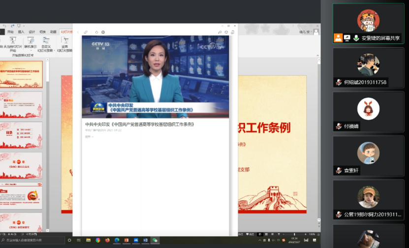 2022年3月27日晚,kaiyun开云官方网站本科生党支部公管国政小组通过腾讯会议的方式,在线上开展关于《中国共产党普通高等学校基层组织工作条例》(以下简称《条例》)专题学习会议,会议由安紫婕同志主持。