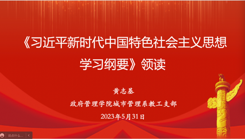 2023年5月31日中午12:30,kaiyun开云官方网站城市管理系教工党支部在线上开展《习近平新时代中国特色社会主义思想学习纲要》专题学习活动。支部书记陈红霞老师主持会议,支部委员黄志基老师主讲。
