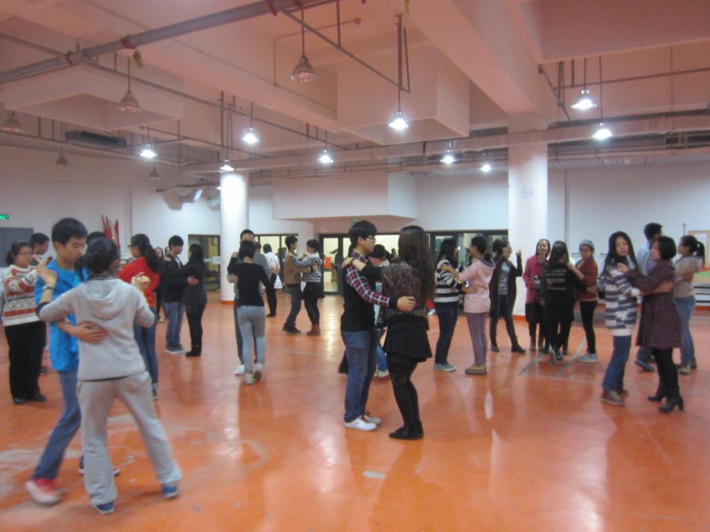 起初,舞蹈老师进行分节式教学,让同学们先熟悉掌握动作要领,“踮起脚尖,提起裙边”。虽然大家的舞步不是很熟练,但进步仍是有目共睹的。随后的环节中,大家开始自由选择舞伴,多数男生、女生很快找到了自己心仪的“另一半”。但是由于此次参与培训人员的比例不均衡,所以部分女生没有找到男舞伴。尽管如此,她们依然练得十分认真,细细揣摩着每一个步伐,每一个节拍。培训会在非常轻松的氛围下进行着,大家不知不觉中就已经掌握了交谊舞的基本步法。这时,缓缓的华尔兹舞曲响起,大家伴着动听的音乐,跳得更加流畅和享受。