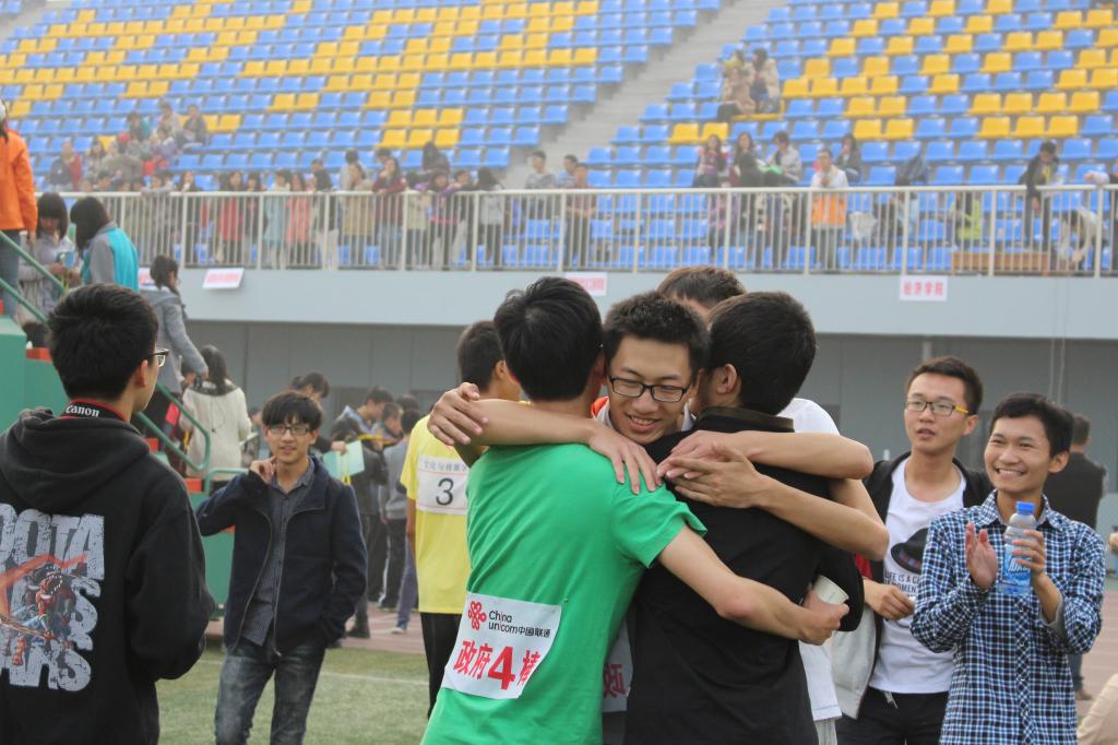 接下来男子组的比赛更是激烈,顺利的交接,矫健的身影,男生们犹如奔腾的骏马,尽情驰骋在赛道上,拉拉队的呐喊助威再次达到高潮,气氛紧张热烈。一个又一个的队员如利剑出鞘飞驰而去,尽管暂时落后,但不灰心不气馁,他们执着坚持,一点一点缩小与对手的间距。最后一百米,比赛进入白热化阶段,第四棒的选手奋起直追,进一步缩小了与对手的距离。到达终点之后,四位队员热情相拥,庆祝共同的胜利。