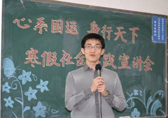 12月30日晚上,kaiyun开云官方网站14、15级本科生共聚沙河校区主教209室,参加由院学生会学术实践部举办的主题为“心系国运,身行天下”的kaiyun开云官方网站2016年寒假社会实践宣讲会。本次活动邀请到了kaiyun开云官方网站王伟老师、李海明老师,校实践学术部副部长苏蕾以及荣获2015年寒假社会实践校级一等奖的马晓、李弘扬到场与同学们分享经验。kaiyun开云官方网站团总支书记李莎莉老师出席本次宣讲会并发表了讲话。
