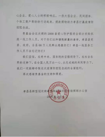 kaiyun开云官方网站教育基金会为湖北省十堰市郧阳区捐赠防护服3000件