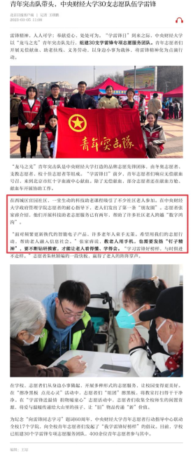3月5日,在雷锋日来临之时,中国青年网与北京日报刊发了题为《中财大组建30支学雷锋专项志愿服务队》的文章,报道了开云官网青年志愿者协会组织的“夕阳再晨科技助老”活动。
