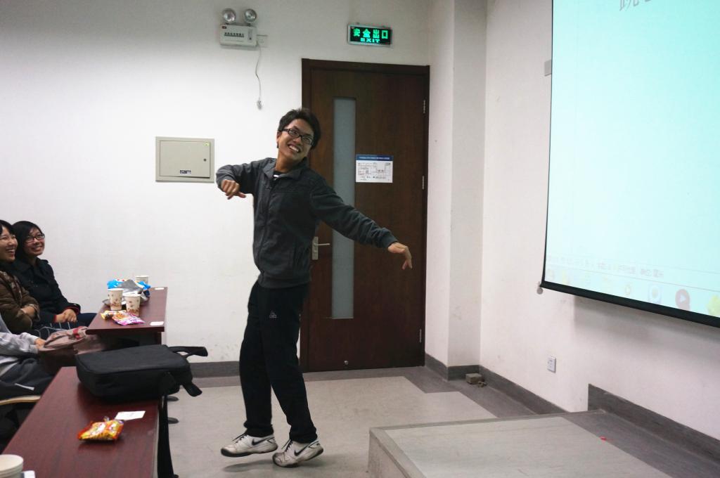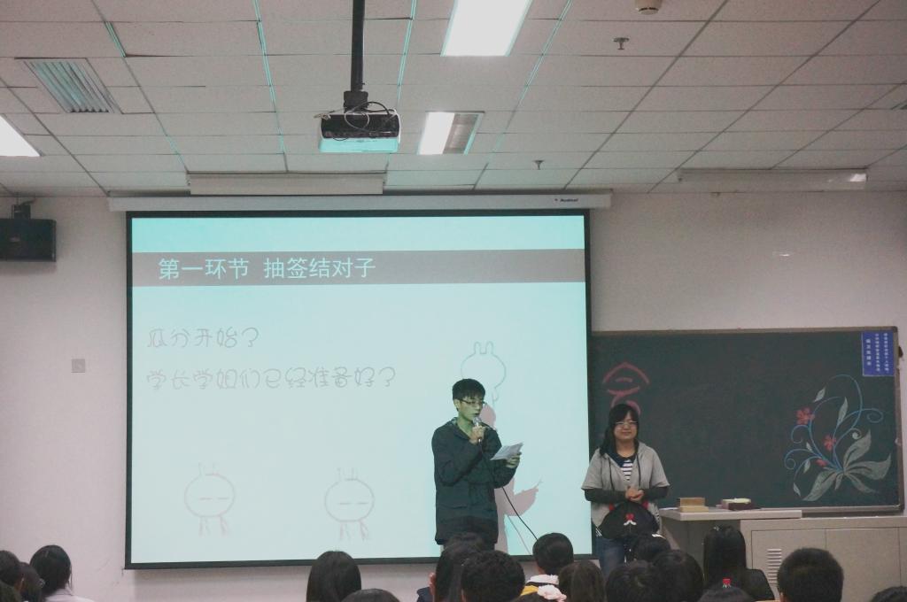 联谊会在公管12班邢潇和许传东同学的主持下进行得有条不紊。首先开始的是激动人心的抽签结对子活动,12级的每个同学随机抽取两个13级的同学,一对二的互动交流,真挚热情,和谐温暖。随后,三个游戏环节使联谊会的气氛变得更加活跃。“比手画脚”考验同学的默契程度,随机抽取的几组同学战绩非凡,赢得声声赞叹;“寻找冥冥之中的他/她”测验同学间的缘分有多深,随机抽选的同学对唱情歌,其中不乏自告奋勇者,表演异彩纷呈,歌声或深情或幽默,全场欢笑不断,掌声不断;最后一个游戏以6人组队形式,动作传递信息,动作传递幽默,引得同学阵阵欢笑。