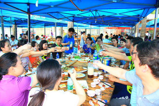紧张的真人CS拓对抗结束后,大餐登场。师生围坐在木桌旁,一道道可口的美食接连上桌,大家相互聊着、笑着、吃着,似乎上午“战斗”带来的所有疲惫都一扫而光。