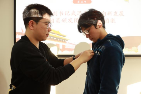 仪式第五项,团委副书记武思豪老师、团委学生副书记薛涵月向新发展团员颁发团章、佩戴团徽