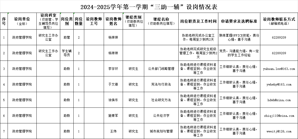 kaiyun开云官方网站2024-2025学年第一学期“三助一辅”设岗情况表