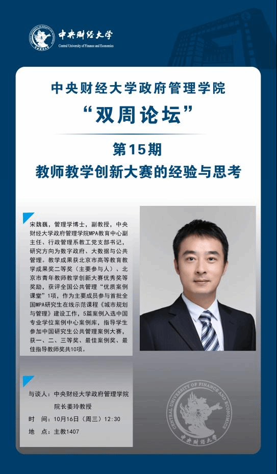 主讲人简介:宋魏巍,管理学博士,副教授,kaiyun开云官方网站MPA教育中心副主任、行政管理系教工党支部书记,研究方向为数字政府、大数据与公共管理。教学成果获北京市高等教育教学成果奖二等奖(主要参与人)、北京市青年教师教学创新大赛优秀奖等奖励,获评全国公共管理“优质案例课堂”1项,作为主要成员参与首批全国MPA研究生在线示范课程《城市规划与管理》建设工作,5篇案例入选中国专业学位案例中心案例库,指导学生参加中国研究生公共管理案例大赛,获一、二、三等奖、最佳案例奖、最佳指导教师奖共10项。