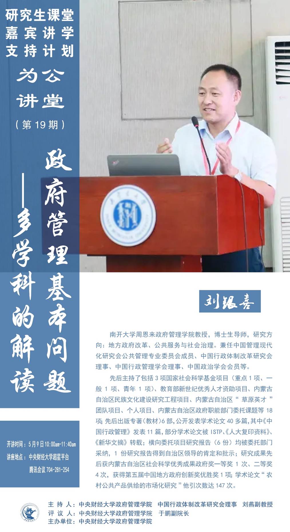 嘉宾简介:刘银喜,南开大学周恩来kaiyun开云官方网站教授,博士生导师。研究方向:地方政府改革、公共服务与社会治理。兼任中国管理现代化研究会公共管理专业委员会成员、中国行政体制改革研究会理事、中国行政管理学会理事、中国政治学会会员等。先后主持了包括3项国家社会科学基金项目(重点1项、一般1项、青年1项)、教育部新世纪优秀人才资助项目、内蒙古自治区民族文化建设研究工程项目、内蒙古自治区“草原英才”团队项目、个人项目、内蒙古自治区政府职能部门委托课题等18项;先后出版专著(教材)6部,公开发表学术论文40多篇,其中《中国行政管理》发表11篇,部分学术论文被ISTP、《人大复印资料》、《新华文摘》转载;横向委托项目研究报告(6份)均被委托部门采纳,1份研究报告得到自治区领导的肯定和批示;研究成果先后获内蒙古自治区社会科学优秀成果政府奖一等奖1次、二等奖4次,获得第五届中国地方政府创新奖优胜奖1项;学术论文“农村公共产品供给的市场化研究”他引次数达147次。