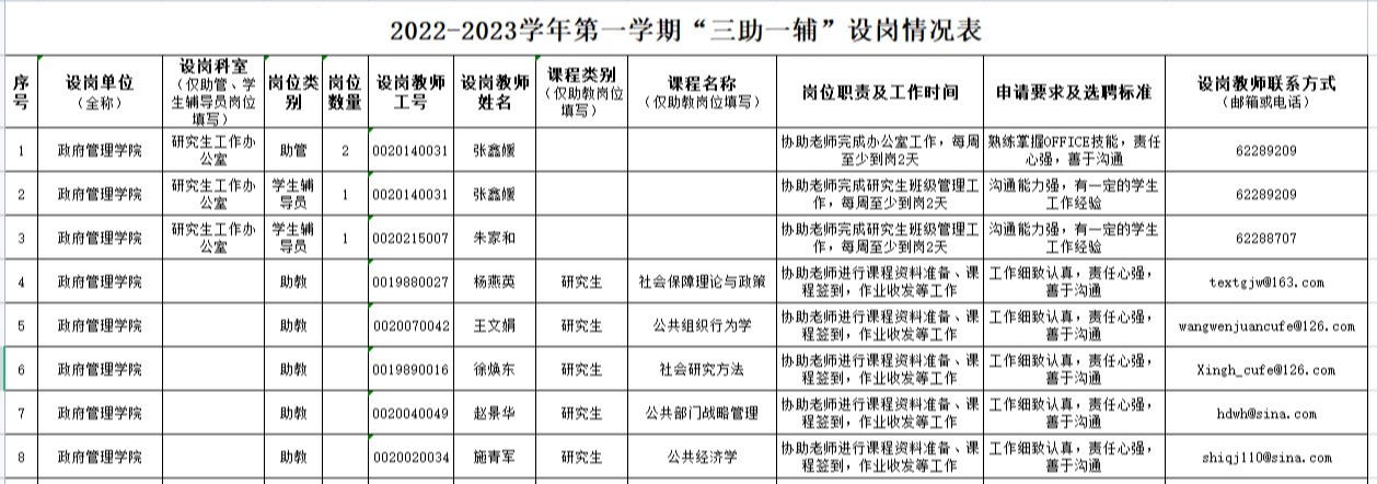 kaiyun开云官方网站2022-2023学年第一学期“三助一辅”设岗情况表