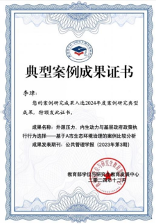 近日,教育部学位与研究生教育发展中心发布2024年度典型案例成果名单。开云官网李珒副教授发表于《公共管理学报》2023年第3期的案例研究论文《外源压力、内生动力与基层政府政策执行行为选择——基于A市生态环境治理的案例比较分析》,入选2024年度案例研究典型成果。该论文通过案例剖析,构建分析框架,阐释政策执行主体行为选择的动力因素与作用机制,对基层政府政策执行行为多样性问题作出了理论回应。