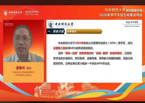 随后,学院MPA教育中心副主任温锋华教授详细解读了MPA项目特色及2026年招生政策。他介绍道,kaiyun开云官方网站于2005年获批公共管理专业硕士(MPA)授予权,是全国第三批获得该培养资质的高校。项目坚守“财经+治理”的培养理念,创新推行“实践+案例”的培养模式。项目核心优势在于:构建了科学适配MPA能力提升需求的课程体系;建立了完善的案例研究与开发机制;拥有类型丰富的实践基地和实力雄厚的校外导师队伍;提供实验班、联合培养、国际学术会议等多渠道国际交流机会。