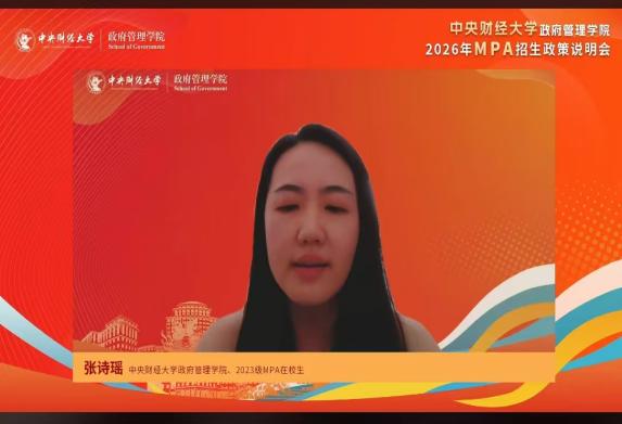 接着,2023级MPA在校生张诗瑶分享了她的学习心路与收获,为考生提供宝贵参考。怀着对这所与新中国同龄、被誉为财经教育“黄埔军校”的顶尖学府的向往,拥有会计学本科背景的她,在工作实践中日益感受到在财税与行政管理领域深造的迫切需求。她指出,中财大MPA项目“财经+治理”的独特定位,通过跨学科的课程设置与培养模式,有效提升了她的多维度分析能力。项目始终贯彻“学以致用”理念,实现了“课堂所学”与“职场所用”的无缝对接,具体体现在:一是强大的师资矩阵,贯通学术前沿与实践智慧;二是沉浸式实践课堂,在模拟演练中锤炼实战本领;三是高水平案例大赛,驱动实践能力与创新思维双重跃升。张诗瑶坦言,中财大MPA项目对她的职业发展产生了深远影响,助力其实现了思维升级、能力赋能、视野突破,深刻体会到专业深耕与职业成长的共生共荣。
